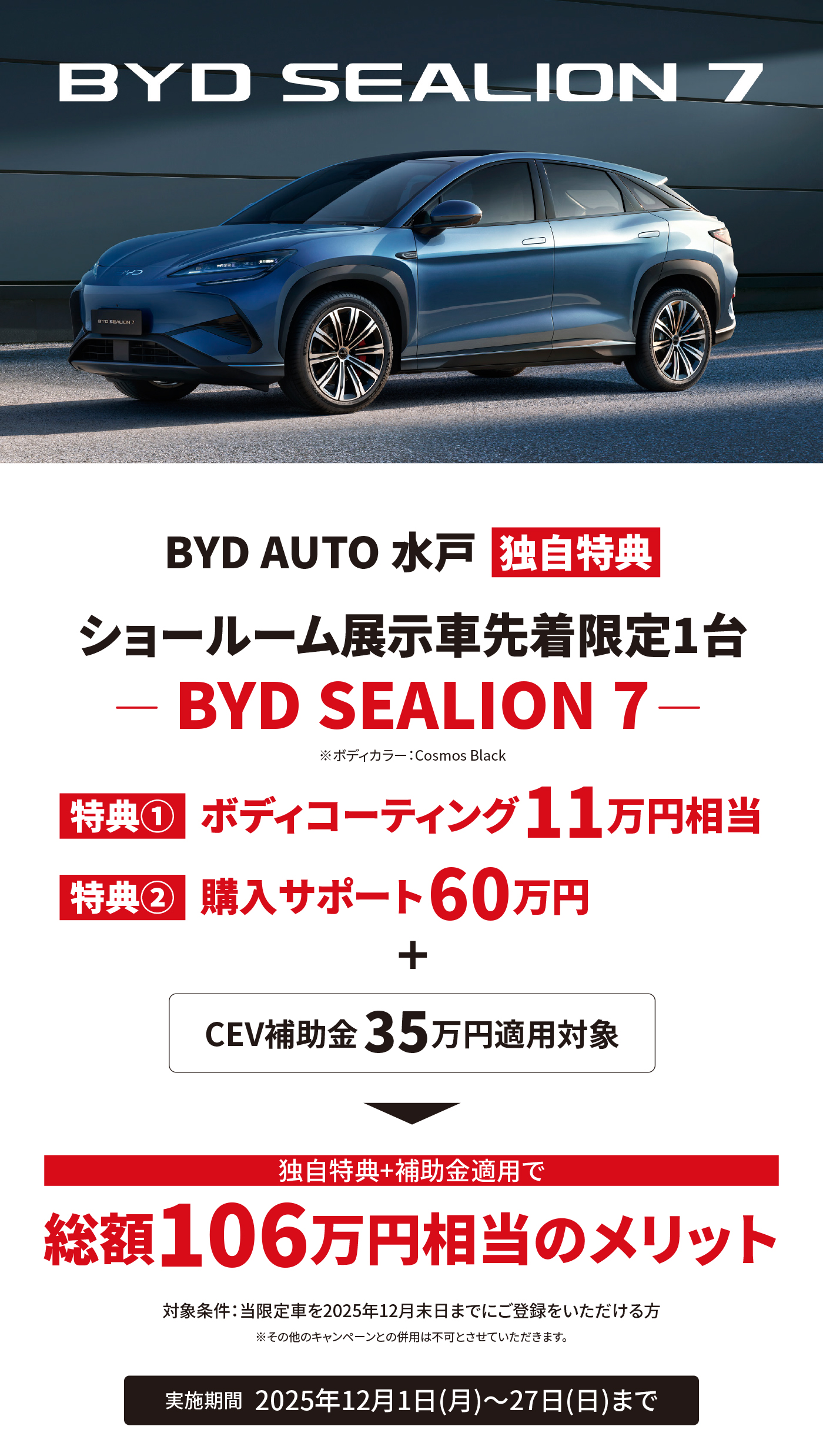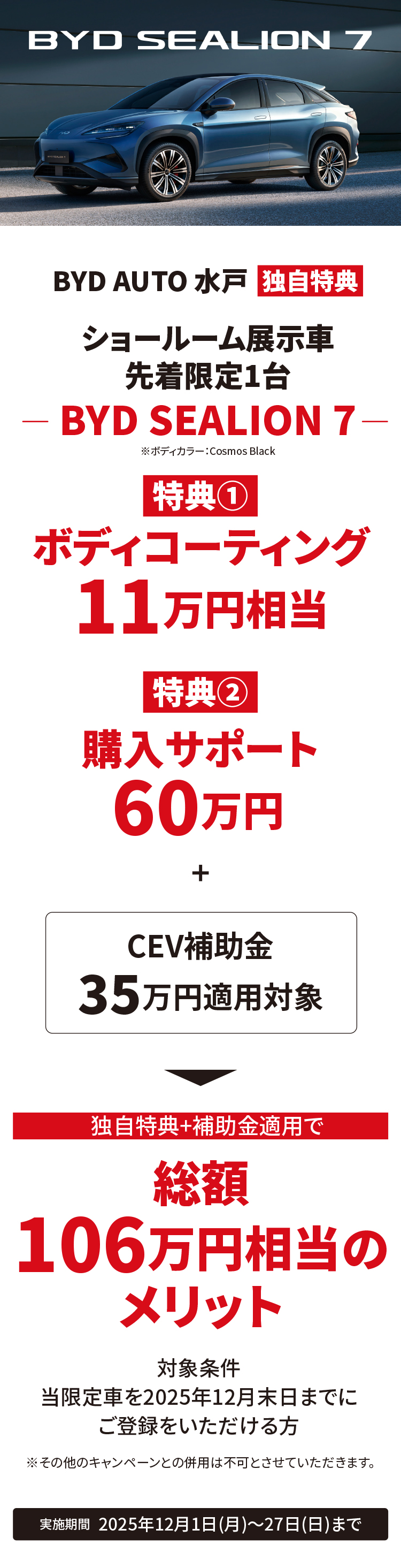 ※令和7年4月1日以降に初度登録した車両には、令和6年度補正予算「クリーンエネルギー自動車導入促進補助金(CEV補助金)」が適用されます。※国が実施する他の補助金と重複申請はできません。地方自治体が交付する補助金とは併用できます。※CEV補助金を受けた車両は定められた期間(乗用車は4年間)保有義務があります。制限期間内に車両を処分した場合は補助金の返還を求められる場合があります。※CEV補助金は予算がなくなり次第、申請受付は終了となります。※補助金の申請・受給には一定の条件があります。詳しくは、当ディーラーまでお問い合わせください。